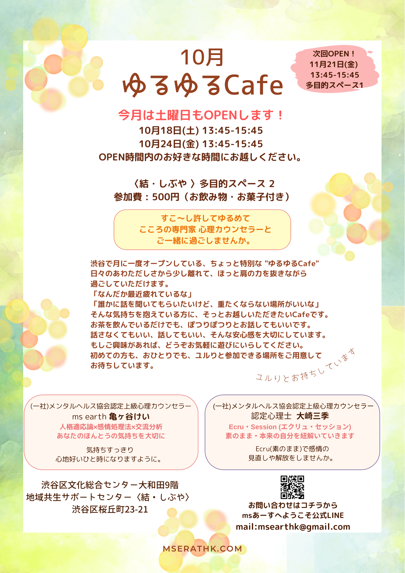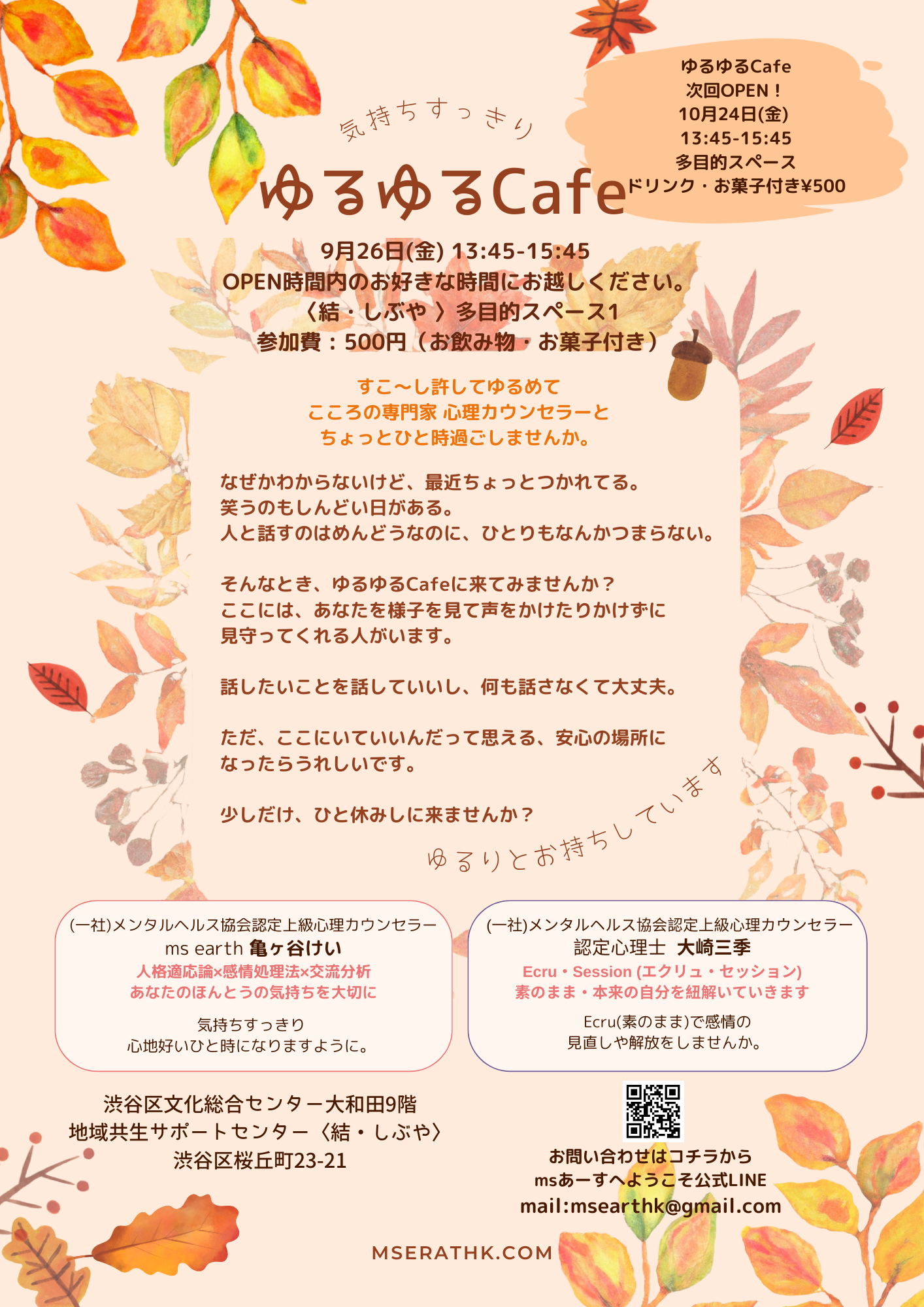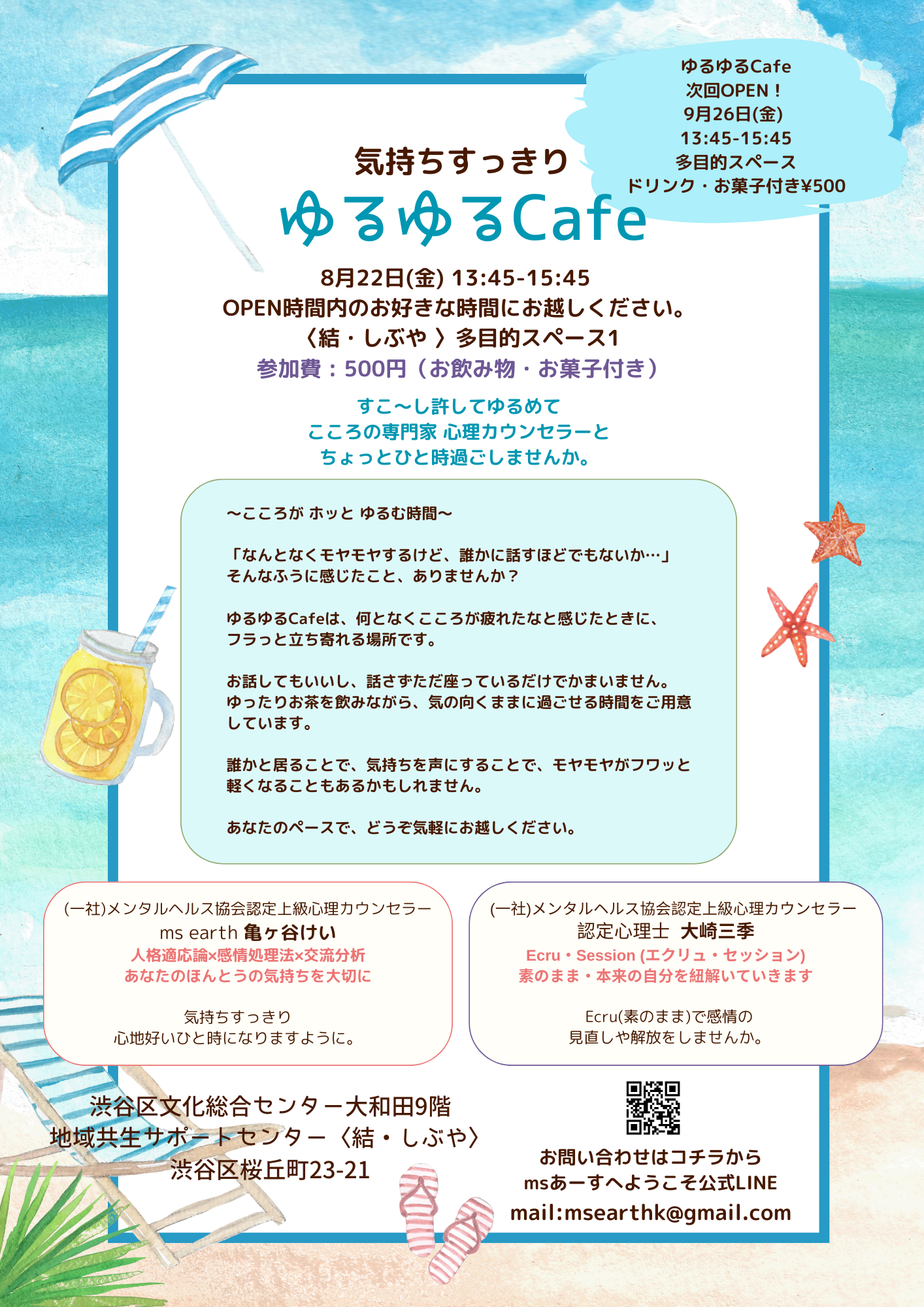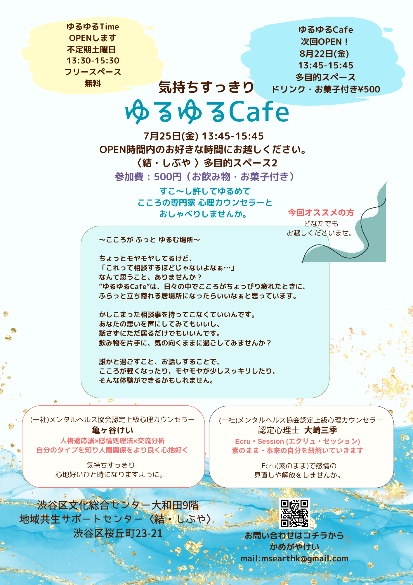 ゆるゆるCafeは、何となくこころが疲れたなと感じたときに、フラッと立ち寄れる場所です。